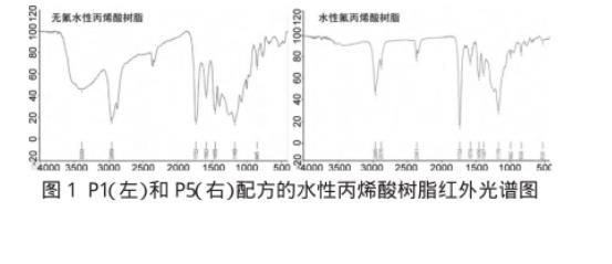 為了表征含氟丙烯酸酯單體是否已經有效成為合成樹脂的一份子,我們對P1(不含氟的水性丙烯酸樹脂)和P5(水性氟丙烯酸樹脂)進行了紅外光譜分析(圖1)。