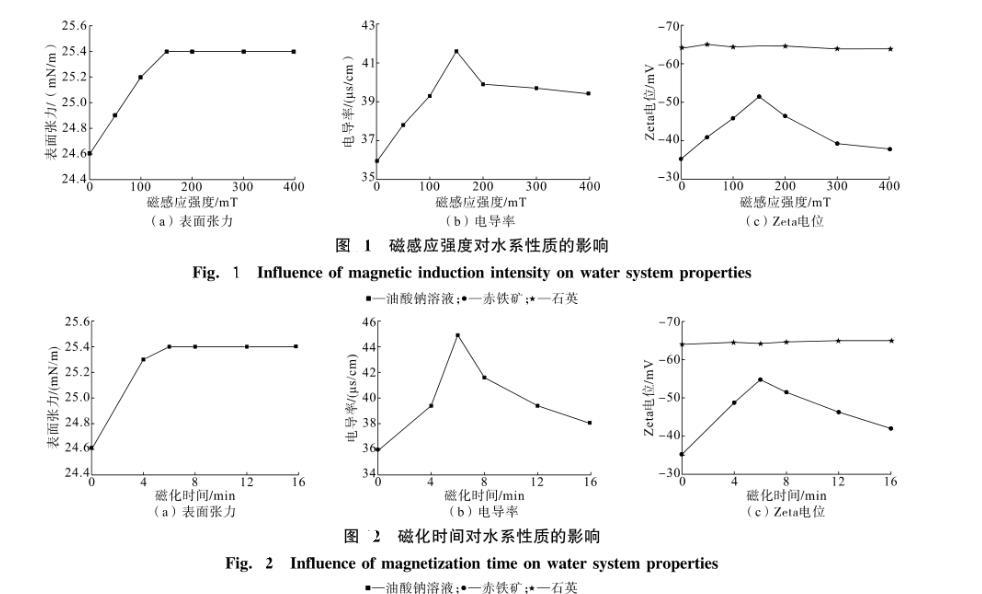 由圖1可知,磁感應強度從0增長到150 mT,油酸鈉的表面張力從24.6 mN/m增長到25.4 mN/m,電導率從35.9μs/cm降低至41.6μs/cm,赤鐵礦的Zeta電位從-35.24mV增長到-51.47mV,石英的Zeta電位幾乎不變;繼續(xù)增大磁感應強度,油酸鈉的表面張力趨于平穩(wěn),電導率緩慢減小,赤鐵礦的Zeta電位減小,石英的Zeta電位幾乎不變。