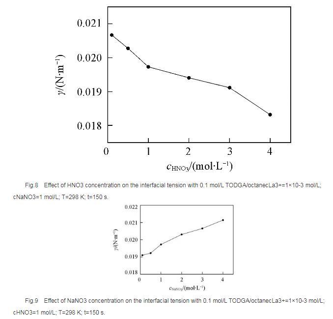 以電解質NaNO3作為離子強度變量,考察了NaNO3濃度變化對界面張力的影響。結果(圖9)表明,界面張力隨著NaNO3濃度的升高而增大,這是由于隨著NaNO3濃度的升高, TODGA在界面上聚集的穩定性降低,降低了其溶解性,增大了界面張力;同時會增強對金屬離子的萃取能力,減少界面上游離的萃取劑分子數,使界面張力增大。