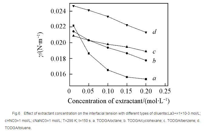 如圖8所示,以正辛烷作為稀釋劑時, TODGA/HNO3萃取La3+的界面張力隨著硝酸濃度的升高逐漸降低。根據文獻報道,在硝酸體系中, 3-氧戊二酰胺類萃取劑能夠萃取硝酸,萃取過程中隨著硝酸濃度升高,萃取分配比明顯增大。因此,硝酸濃度較高時TODGA與硝酸發生萃取締合作用,使中性萃取劑TODGA質子化,其界面活性明顯增強,導致界面張力迅速降低,這與圖3結果一致。