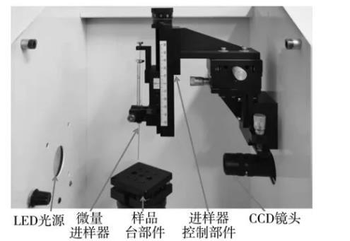 實(shí)驗(yàn)采用SL200A型接觸角儀來產(chǎn)生液滴,獲取液滴圖像。該儀器的主機(jī)如圖2所示,主要組成部件為:光源控制部件(可調(diào)亮度LED光源)、CCD鏡頭(75 mm焦距,25幀/秒)、進(jìn)樣器控制部件(可升降12.5 mm,0.01 mm微距)、樣品臺(tái)部件(樣品臺(tái)面50×50 mm)、圖像采集卡(25幀/秒)、手動(dòng)控制微量進(jìn)樣器(10、25、50μL)。實(shí)驗(yàn)采用表面張力與接觸角分析系統(tǒng)的CAST2.0軟件控制拍攝過程。采用連續(xù)拍攝方式,圖像采集速率為25幀/s,連拍100幀,獲取液滴圖像。實(shí)驗(yàn)樣品為黏度系數(shù)為50 mm2/s、100 mm2/s、350 mm2/s、500 mm2/s的硅油,其中黏度系數(shù)為50 mm2/s、100 mm2/s的硅油密度σ為965 kg/m3,黏度系數(shù)為350 mm2/s、500 mm2/s的硅油密度σ為970 kg/m3[14]。