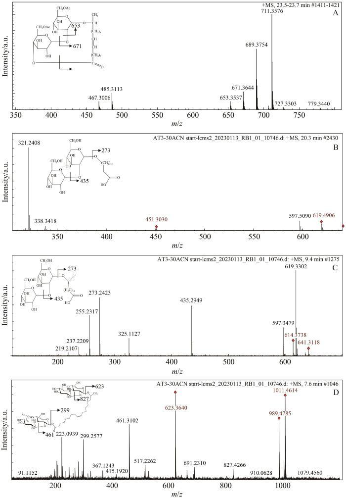 圖2(A)乙酰化SLs保留時(shí)間為23.6 min組分的質(zhì)譜圖.(B)去乙酰化SLs保留時(shí)間為20.3 min組分的質(zhì)譜圖.(C)去乙酰化SLs保留時(shí)間為9.4 min組分的質(zhì)譜圖.(D)去乙酰化SLs保留時(shí)間為7.6 min組分的質(zhì)譜圖