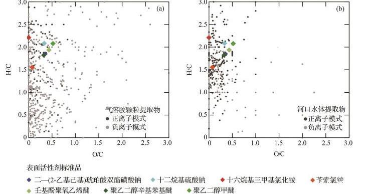 圖1氣溶膠顆粒(a)和河口水體(b)表面活性劑類有機物的Van Krevelen圖