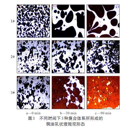 圖3不同時間下3種復合體系所形成的稠油乳狀液微觀形態(tài)