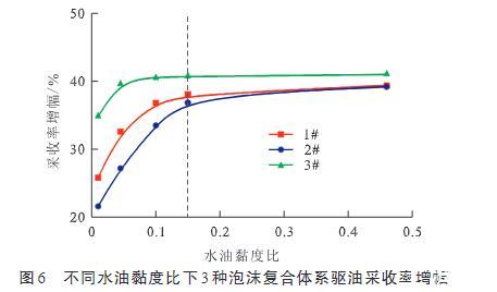 圖6不同水油黏度比下3種泡沫復合體系驅油采收率增幅