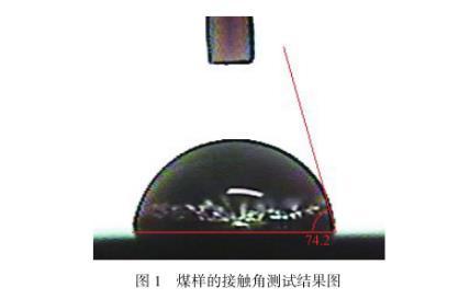 圖1為本實(shí)驗(yàn)所選煤樣的接觸角測(cè)試結(jié)果圖,由圖可以看出,煤樣的接觸角為74.2°,相較于其他類型的煤(接觸角為20.55°,22.34°,34.23°和29.75°),其接觸角明顯偏大,具有較強(qiáng)的疏水性。