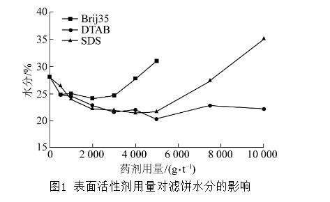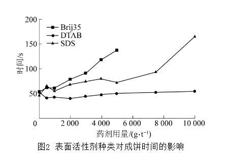 過濾過程中,成餅速率與脫水速率成正比,成餅速率越快,過濾時間越短。從圖2可以看出,Brij35和SDS兩種藥劑的成餅時間均隨藥劑量的增加而增加,Brij35的增加最為迅速,在用量為4 000 g/t時從不添加藥劑時的55 s上升至137 s,SDS在達到最佳藥劑量之前成餅時間變化并不明顯,但在超過最佳藥劑量后,成餅時間迅速上升。DTAB能略微減少成餅時間,在最佳用量時成餅時間從不添加藥劑時的55 s減少到50 s。