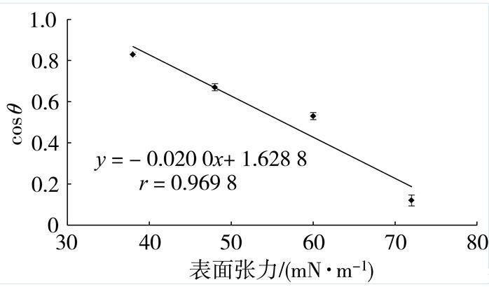 葉片臨界表面張力直接影響藥液在葉片表面的沉積特性,臨界表面張力越小越不利于藥液霧滴的沉積、潤濕和展布。測試液的表面張力與cosθ間呈顯著負相關關系(圖3),其擬合方程為y=0.020 0x+1.628 8(r=0.969 8),其中x為表面張力,y為cosθ。根據(jù)擬合方程計算得到煙草葉片的臨界表面張力為31.44 mN/m。與王亞虹等和陳海濤等測定的K326和云87兩個煙草品種相近,表明不同煙草品種葉片臨界表面張力值差異不大,且明顯低于小麥、棉花和茄子等,說明普通農(nóng)藥霧滴不容易在煙草葉片表面潤濕和展布,因此需要合理使用助劑降低農(nóng)藥藥液的表面張力至低于煙草葉片臨界表面張力。
