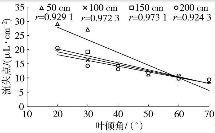 流失點是農(nóng)藥噴施量的關鍵決定參數(shù),當農(nóng)藥噴施量超過流失點,會減少藥液在葉片表面的持留量,降低藥效且造成農(nóng)藥的浪費。圖4表明,流失點與葉傾角呈顯著負相關,且隨著噴霧距離增加,斜率降低,說明葉傾角和噴霧距離對流失點均有顯著影響。