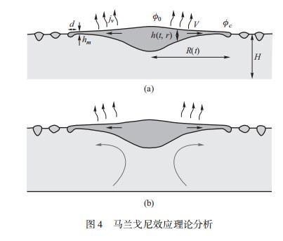 馬蘭戈尼效應是指由于表面張力不同的二種液體的界面存在表面張力梯度而使質量傳送的現象。出現馬蘭戈尼效應的原因是表面張力大的液體對其周圍表面張力小的液體的拉力強,產生表面張力梯度;使液體從表面張力低的方向向表面張力高的方向流動。此時引入馬蘭戈尼效應,就是對前文所說理論的一個形象簡潔的概括。當酒精濃度超過某一閾值,液滴擴散。酒精蒸發液滴外圍較薄的區域變得富含水,當外圍局部濃度小于閾值,擴散停止。空間上不均勻的混合物濃度產生沿液滴半徑的表面張力梯度,它們將溶質從油滴中心向外驅動。蒸發優先消耗位于邊緣附近的液滴最薄部分的酒精,而乙醇含量的變化導致朝向液滴邊緣的界面張力增加。這些梯度會在混合空氣和混合油界面處產生馬蘭戈尼切向應力,從而驅動從液滴中心到外圍的徑向流動。液滴邊緣脫濕和向外的馬蘭戈尼流動效應的結合導致液滴的外圍形成較厚的邊緣,從而變得不穩定,分裂成無數的小液滴,產生液滴爆炸的物理現象。馬蘭戈尼效應示意圖如圖4所示,黑箭頭代表蒸發量和厚度的徑向減小,灰色箭頭代表液滴中馬蘭戈尼應力與油層中的黏性應力平衡,導致大量流動。h(r,t)是液滴的厚度剖面,R(t)是中心液滴的半徑,H是油面厚度。