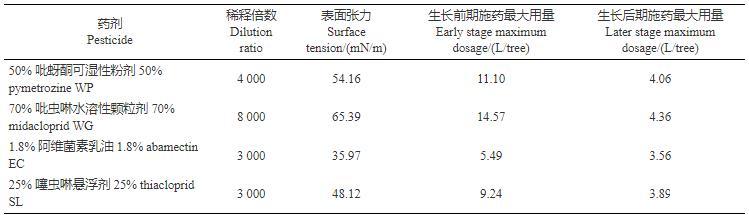 基于2.3節中表面張力與Rm值之間的關系,選取4種常用農藥制劑(50%吡蚜酮可濕性粉劑、70%吡蟲啉水溶性顆粒劑、1.8%阿維菌素乳油和25%噻蟲嗪懸浮劑),測定其最大表面張力,結合果樹常用冠層參數(平均葉傾角、葉面積指數等)對果樹施藥用量進行預測評估,從而為大容量果樹精準用藥提供理論基礎。