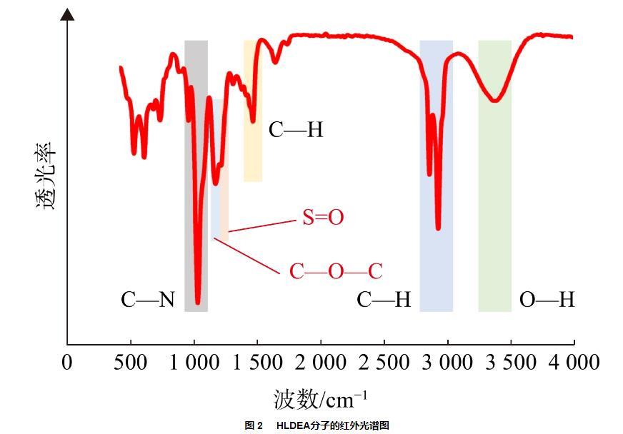 紅外光譜中峰的位置及形狀與分子中鍵的種類和環(huán)境具有對應(yīng)關(guān)系,通過分析所得譜圖可得到物質(zhì)的化學(xué)和結(jié)構(gòu)組成的相關(guān)信息。圖2所示為HLDEA分子的紅外光譜圖。由圖2可知,合成后的HLDEA在3354.44 cm?1處出現(xiàn)O—H鍵的伸縮振動(dòng)峰,2921.96 cm?1和2852.77 cm?1處的雙峰代表C—H鍵的伸縮振動(dòng)峰,1463.05 cm?1處出現(xiàn)C—H鍵的彎曲振動(dòng)峰,1028.50 cm?1處出現(xiàn)C—N鍵的伸縮振動(dòng)峰,1215.97 cm?1處出現(xiàn)了S=O鍵的伸縮振動(dòng)峰及1168.25 cm?1處C—O—C鍵的伸縮振動(dòng)峰。C—O—C鍵和S=O鍵對應(yīng)的振動(dòng)峰來自生成的醚鍵和引入的磺酸根,這兩處峰的存在證明了反應(yīng)成功發(fā)生,磺酸基團(tuán)被接到LDEA分子上。
