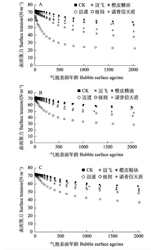 某種液體形成新的表面時(shí),其表面張力與溶劑本身的表面張力相當(dāng),需要經(jīng)過(guò)一段時(shí)間表面張力才會(huì)降低到吸附平衡時(shí)的狀態(tài)。農(nóng)業(yè)上對(duì)病蟲(chóng)害進(jìn)行防治時(shí),藥液某段時(shí)間的動(dòng)態(tài)表面張力越低,藥液從噴頭噴出霧滴的粒徑越小,并且越容易在葉片上鋪展?jié)櫇瘛L砑硬煌N類(lèi)助劑產(chǎn)品后乙基多殺菌素藥液動(dòng)態(tài)表面張力的變化見(jiàn)圖2。當(dāng)氣泡年齡小于100 ms時(shí),藥液表面張力接近溶劑(水)的表面張力,之后隨著氣泡表面年齡的增加,各處理組表面張力的差異越顯著。助劑質(zhì)量分?jǐn)?shù)為0.1%時(shí),動(dòng)態(tài)表面張力的下降程度為極潤(rùn)>邁道>邁飛>諾普信天盾>橙皮精油。助劑質(zhì)量分?jǐn)?shù)為0.05%和0.025%時(shí),隨著助劑含量的降低,添加極潤(rùn)藥液的動(dòng)態(tài)表面張力降低到最小,其次是邁道,其他助劑產(chǎn)品的差異越來(lái)越不明顯。