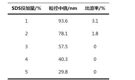 在SDS為乳化劑、產(chǎn)品有效質(zhì)量分?jǐn)?shù)為12%條件下,考察SDS投加量對產(chǎn)品粒徑中值、穩(wěn)定性的影響,結(jié)果見表1。