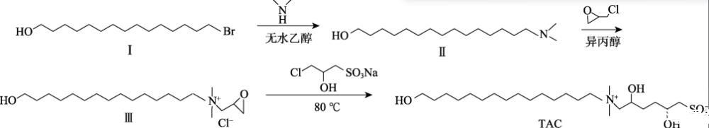 本文擬以15-溴-1-十五醇、二甲胺水溶液、環氧氯丙烷、3-氯-2-羥基丙磺酸鈉為原料,通過季銨化反應和開環反應制備了甜菜堿表面活性劑(TAC)。通過聚合物和表面活性劑分子的疏水單元組成的混合膠束與聚合物主鏈發生物理交聯,從而產生擴展的聚合物網絡,以期改善稠化酸的耐溫、耐剪切性能,提高180℃高溫地層的油氣采收率。