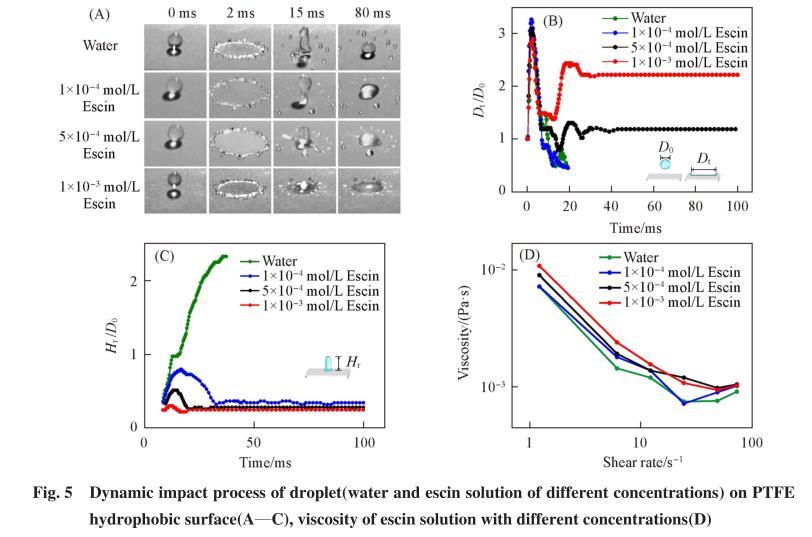 圖5(A)展示了水和不同濃度七葉皂素溶液撞擊PTFE疏水表面的動態過程.可以看出,水在撞擊PTFE表面后完全彈起,而且有較多飛濺碎裂,在80 ms時并不能潤濕疏水表面.七葉皂素濃度為1×10-4mol/L時,液滴在撞擊后仍有較大程度的反彈,但未能完全彈起,且平衡后在一定程度上實現了鋪展.當濃度升高至5×10-4mol/L,液滴的反彈得到了明顯抑制,平衡后在疏水表面的沉積和鋪展有所改善.濃度進一步升高至1×10-3mol/L時,液滴不再有明顯的反彈趨勢,且碎裂現象也得到了很好的抑制,平衡后能在表面很好地沉積和鋪展.