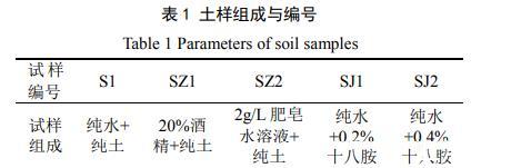 試驗用土取自云南省境內(nèi)昆曲高速公路嚴家山段,為淺灰色弱膨脹土,其自由膨脹率為55.7%,液限為41%,塑限為20.3%。取回的土樣經(jīng)過風干、碾碎后過2 mm的篩備用。為研究氣–液界面張力對膨脹土干縮開裂的影響,采用3種不同表面張力的液體作為土中的液相,分別為:純水、體積百分數(shù)為20%的酒精溶液和含量為2 g/L的肥皂水;通過在土體中混合斥水劑的方法配制不同接觸角的土樣,斥水劑十八烷基伯胺(C18H39N),簡稱:十八胺,為堿性白色蠟狀粉末,純度為99%,配制兩種斥水土樣,十八胺含量分別為:0.2%和0.4%。各土樣的成分和編號如表1所示。
