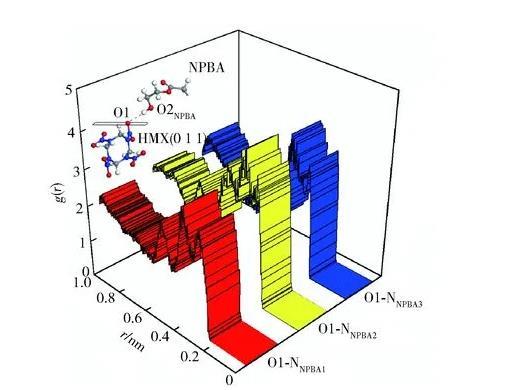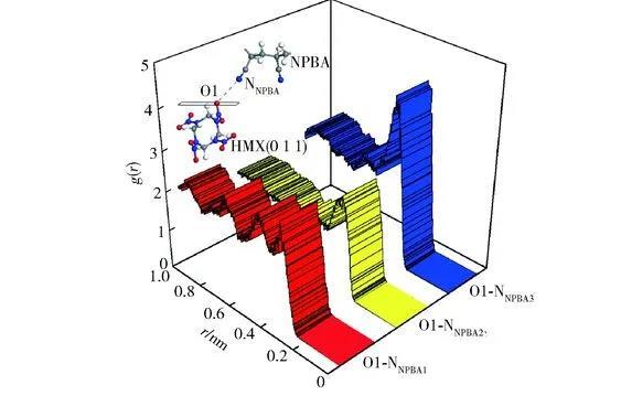 HMX(0 1 1)晶面上—NO2基團中氧原子O1與NPBA分子鏈上—CN基團上氮原子NNPBA之間的徑向分布函數曲線見圖3.