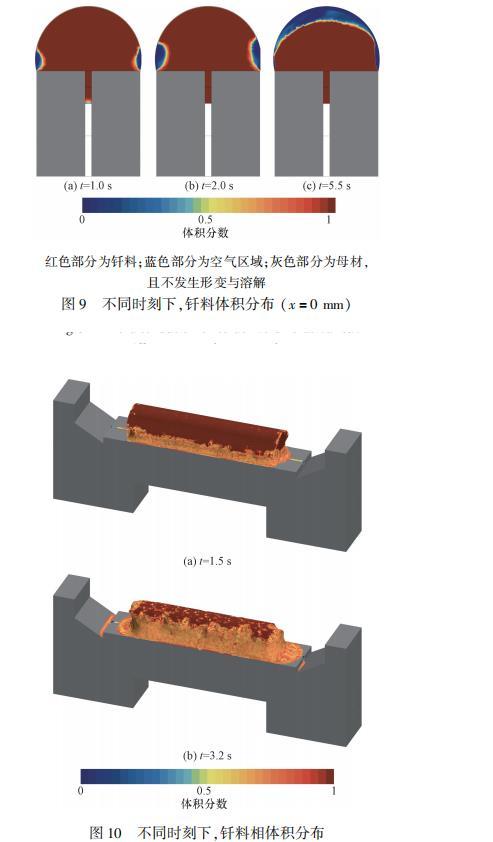 為充分評估釬料填充焊縫的流動,給出了不同時刻下x=0mm截面處的釬料體積分布(圖9),截面兩側釬料融化過程基本呈對稱分布。涂覆釬料從底部開始融化,并不斷填充焊縫,兩側慢慢形成了“凹”形液面。隨著保溫過程進行,釬料均融化為液態,液態釬料在表面張力的作用下收縮為半球形狀。