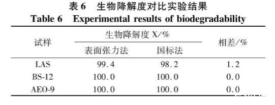 對(duì)比兩種方法得出的生物降解度,由表6可知,表面張力法計(jì)算得出的生物降解度比國(guó)標(biāo)法測(cè)定的結(jié)果偏高或者一致,兩者相差小于2%,可認(rèn)為兩種方法均可測(cè)定表面活性劑的生物降解度,其結(jié)果均可信。