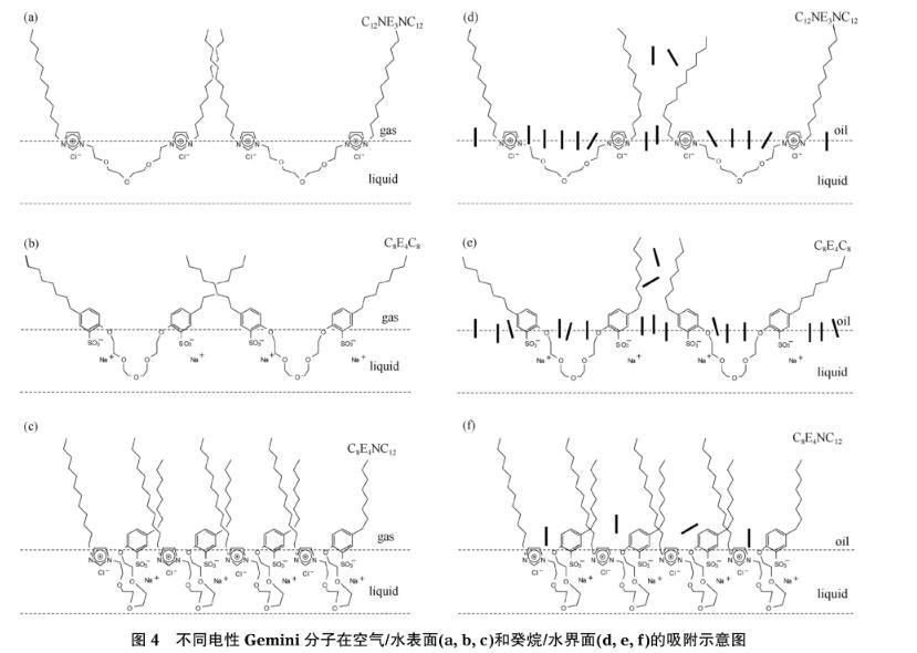 圖4不同電性Gemini分子在空氣/水表面(a,b,c)和癸烷/水界面(d,e,f)的吸附示意圖