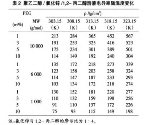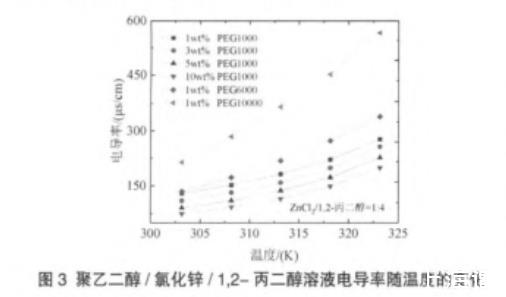 表2聚乙二醇/氯化鋅/1,2-丙二醇溶液電導(dǎo)率隨溫度變化