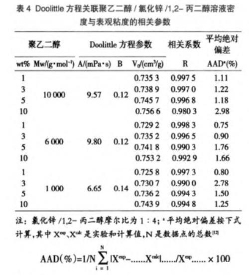 表4 Doolittle方程關(guān)聯(lián)聚乙二醇/氯化鋅/1,2-丙二醇溶液密度與表觀粘度的相關(guān)參數(shù)