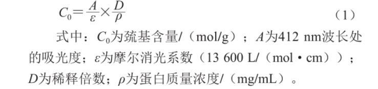 式中:C0為巰基含量/(mol/g);A為412 nm波長處的吸光度;ε為摩爾消光系數(shù)(13 600 L/(molgcm));D為稀釋倍數(shù);ρ為蛋白質量濃度/(mg/mL)。