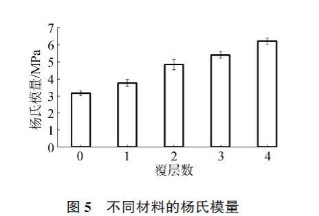 對羥基磷灰石和覆層材料的楊氏模量進(jìn)行了測量,結(jié)果如圖5所示。空白的羥基磷灰石材料的楊氏模量為3.14±0.16 MPa,隨著覆層層數(shù)的增加楊氏模量逐漸增加,最高可達(dá)6.21±0.18 MPa,說明膠原蛋白肽的覆層能夠有效地改善羥基磷灰石材料的力學(xué)性能,提高其楊氏模量。