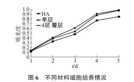 MC3T3-E1細(xì)胞在羥基磷灰石和覆層材料上培養(yǎng)5天的增殖情況見圖6。因結(jié)果類似,圖中僅列出了單層和4層覆層材料的增殖結(jié)果,可以看出在覆層材料上MC3T3-E1細(xì)胞增殖要優(yōu)于空白羥基磷灰石材料,表明所制覆層材料不僅無細(xì)胞毒性,而且因膠原蛋白肽的優(yōu)良生物相容性,能一定程度上促進(jìn)細(xì)胞增殖。所用的羥基磷灰石和膠原蛋白肽都是經(jīng)過實(shí)踐證明的生物相容性良好的材料,其對材料生物性能的提升作用是由其本身的生物相容性良好引起的,因此覆層層數(shù)對生物性能提升作用不明顯。