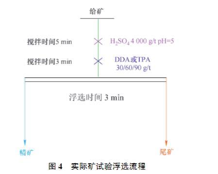 在XFG掛槽浮選機上進行實際礦浮選試驗,轉(zhuǎn)速設(shè)為1 992 r/min。每次稱取250.0 g礦樣放入0.5 L浮選槽中,加入0.3 L自來水;綜合考量文獻調(diào)研、純礦物浮選結(jié)果、經(jīng)濟性等方面因素,確定礦漿pH值等于5為較佳的浮選pH條件。使用H?SO?作為pH調(diào)整劑,調(diào)節(jié)礦漿pH值為5,攪拌礦漿5 min后,加入一定量的DDA或TPA,攪拌3 min后開始用刮板刮出泡沫產(chǎn)品,每間隔3 s刮1次,浮選刮泡時間為3 min。結(jié)束后將得到的泡沫產(chǎn)品和槽內(nèi)產(chǎn)品分別烘干、稱量,測定品位,并計算產(chǎn)率與回收率。實際礦浮選試驗流程如圖4所示。