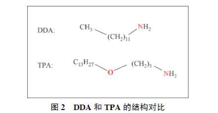 試驗所用藥劑NaOH、H?SO?均購于廣州試劑廠;DDA購于上海阿拉丁生化科技股份有限公司,TPA為工業(yè)來源藥劑,購買自山東派尼新材料股份有限公司。試驗用水為超純水,電阻率為18.25 MΩ·cm。捕收劑結(jié)構(gòu)如圖2所示。