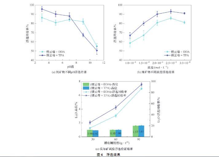 (1)DDA及TPA在酸性及藥劑用量較大的條件下對鋰云母有較好的浮選回收率,且TPA的浮選回收率更高。pH值為5、藥劑用量為2.0×10??mol/L時,DDA、TPA對鋰云母浮選回收率分別為80.84%和90.12%。實際礦浮選試驗也驗證了TPA對鋰云母的浮選性能更好,pH值為5、藥劑用量為60 g/t時,DDA對鋰云母浮選回收率為38.2%,鋰云母精礦品位為0.98%;TPA對鋰云母浮選回收率為53.0%,鋰云母精礦品位為1.00%。