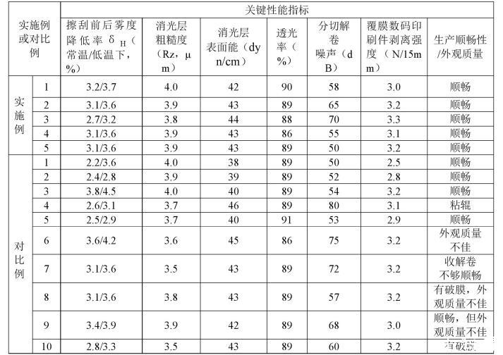 從實(shí)施例1~實(shí)施例5的數(shù)據(jù)可知,本發(fā)明的耐擦刮無膠消光膜在常溫和低溫環(huán)境下均具有良好的耐擦刮性能,實(shí)現(xiàn)了消光層表面在耐擦刮性、高表面張力(與印刷適性正相關(guān))與收解卷順暢性的平衡。其中實(shí)施例4中球體抗粘連劑為球體聚硅氧烷,雖然制得的薄膜的透光率相比實(shí)施例2有所下降,但是薄膜的分切解卷噪聲降低明顯,總體性能是符合本申請要達(dá)到的目標(biāo)的。實(shí)施例5中,在熱復(fù)合層中加入了適宜熔融指數(shù)的高密度聚乙烯,其制備的耐擦刮無膠消光膜表現(xiàn)出更低的分切解卷噪聲,解卷順暢性更好,且未對薄膜的透光率和熱復(fù)合層與印刷件之間的剝離強(qiáng)度產(chǎn)生不良影響。
