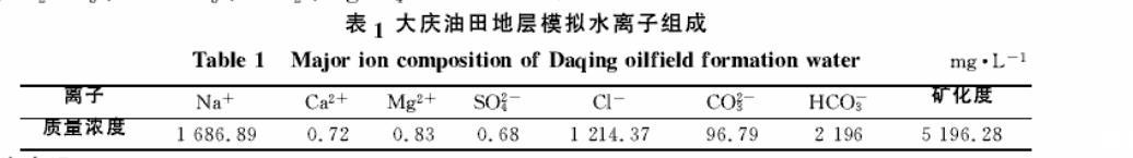 實(shí)驗(yàn)用油樣為大慶原油與煤油按體積比9∶1混合而成(簡(jiǎn)稱(chēng)模擬油)。其中,大慶原油酸值為0.05 mg KOH/g;煤油由北京燕山石油化工有限公司提供,實(shí)驗(yàn)前用活化后的硅膠反復(fù)吸附處理,處理后與二次蒸餾水界面張力大于48mN·m—1.實(shí)驗(yàn)用Na2CO3弱堿溶液(簡(jiǎn)稱(chēng)Na2CO3溶液)由Na2CO3與蒸餾水配置,質(zhì)量分?jǐn)?shù)為0.53%.實(shí)驗(yàn)用水樣為大慶油田地層模擬水(簡(jiǎn)稱(chēng)模擬水),離子組成見(jiàn)表1.實(shí)驗(yàn)所用試劑NaCl、Na2CO3、NaHCO3、CaCl2、MgSO4均為分析純。