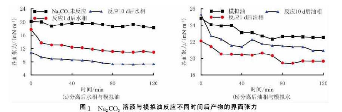 由圖1(b)可以看出,Na2CO3溶液與模擬油反應(yīng)1d和10d后分離出的油相與模擬水間界面張力低于模擬油與模擬水間的界面張力。這是由于Na2CO3溶液與模擬油反應(yīng)生成油溶性的界面活性物質(zhì)且留在油相中,隨著反應(yīng)時(shí)間的增加,反應(yīng)生成的界面活性物質(zhì)增多,使界面張力較模擬油與模擬水的界面張力降低。這說(shuō)明模擬油中存在相對(duì)分子質(zhì)量較大且反應(yīng)活性低的界面活性物質(zhì),長(zhǎng)時(shí)間與Na2CO3溶液反應(yīng)后生成油溶性較強(qiáng)的界面活性物質(zhì)且溶于油相中,使油水界面張力下降較多。
