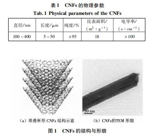 CNFs購自北京博特萬德有限公司,其物理參數如表1所示,其微觀結構及形貌如圖1所示.SDS(白色針棒狀顆粒,AR)購自天津科密歐化學試劑研發中心;PAA(無色液體,AR)購自天津大茂化學試劑廠;Tx100(淡黃色黏稠液體,AR)購自天津大茂化學試劑廠;D-180(乳白色高黏稠液體)由德國畢克公司提供;SDBS(白色粉末,AR)購自天津科密歐化學試劑研發中心.