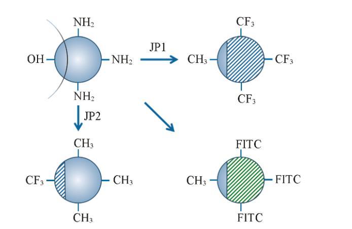 利用相同的方法制備另一種具有不同氟碳鏈覆蓋面積的Janus顆粒。將部分表面帶有APS的SiO?顆粒分散到80 mL甲苯溶液中,加入PFTS(2×10?2 mol/L)于18℃反應(yīng)6 h,然后分散在2.4×10?2 mol/L的OA溶液中并攪拌48 h,將所制得的顆粒命名為JP2,制備過(guò)程如Scheme 1所示。