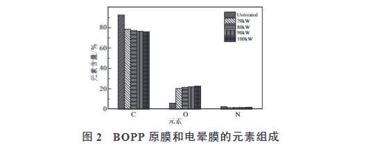 (2)電暈處理導致了BOPP薄膜的C含量顯著下降,O含量大幅增加,N含量輕微下降;隨著電暈功率的增加,BOPP薄膜表面與空氣的化學反應更徹底,引起O和N含量增加,C含量下降。