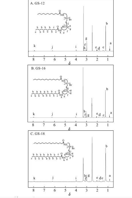根據方案1的合成路線,成功制備了3種以1,4-二溴-2-丁烯為連接基團的酰胺基Gemini表面活性劑。利用紅外和核磁對酰胺基Gemini表面活性劑GS-12,GS-16,GS-18進行結構表征,結果見圖1和圖2。