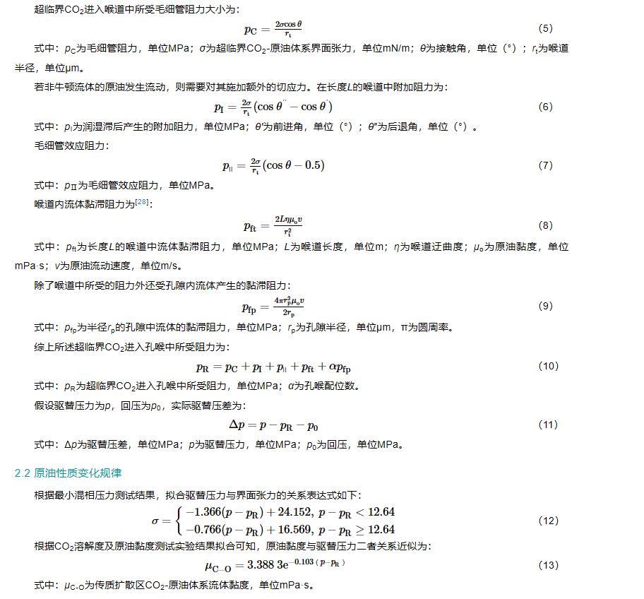 由于各個油藏的實際情況存在差異,因此該模型應用的過程中需要結合油藏最小混相壓力、喉道尺寸分布公式、驅替壓力與界面張力的關系表達式、原油黏度與驅替壓力的關系表達式等。