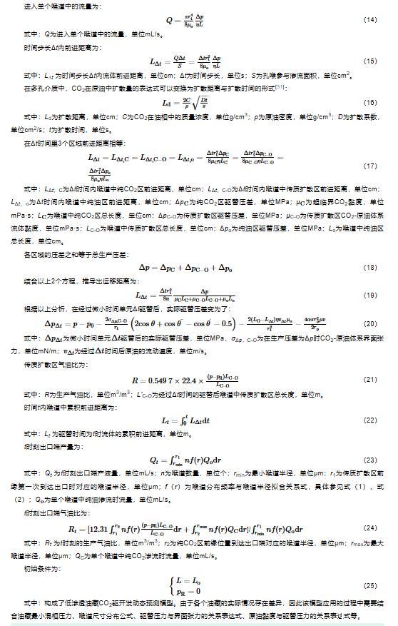 在明確巖心孔喉大小及分布的前提下,借助滲流力學基本理論,以毛管束模型為基礎,運用時間節點分析法,分析了超臨界CO2在多孔介質中的滲流特征,建立了低滲透油藏CO2驅開發全過程產量計算模型,為油田CO2驅開發動態預測、效果評價和剩余油表征提供理論支撐,指導油田進行開發政策的調整。