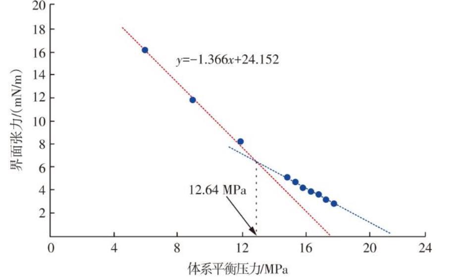 如圖2所示,懸滴法測試結果表明:當體系平衡壓力<12.64 MPa時,界面張力隨體系平衡壓力的增大而快速減小,其線性擬合的直線與X軸交點位于17.56 MPa,該體系平衡壓力為多級接觸最小混相壓力;當體系平衡壓力≥12.64 MPa時,界面張力減小幅度變緩,線性擬合的直線與X軸交點位于21.63 MPa,代表了CO2與原油一次接觸最小混相壓力。