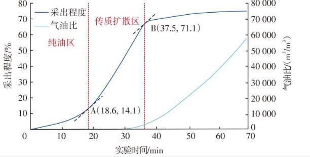 總結(jié)以上分析認為,CO2驅(qū)生產(chǎn)動態(tài)規(guī)律為:在CO2驅(qū)替前緣未達到井口前采出端為純油流,此階段CO2-原油體系作用時間短,溶解降黏、萃取等作用效果不明顯,因此采油速度小、單井產(chǎn)量低且油井不見氣,如圖6中的純油區(qū),該區(qū)域主要依靠CO2驅(qū)動力采油,采出程度曲線呈緩慢上升驅(qū)勢。隨著開發(fā)推進,CO2-原油體系作用時間增加,溶解降黏、萃取等作用逐漸占據(jù)主要作用,原油黏度減小,此時油井開始緩慢見氣。如圖6中的傳質(zhì)擴散區(qū),油井產(chǎn)量增加,采油速度加快,采出程度曲線快速上升。在純油區(qū)向傳質(zhì)擴散區(qū)過渡階段,采出程度曲線上存在一切點(圖6中A點),其對應的時間18.6 min為見氣時間,對應的采出程度14.1%為純油區(qū)推進至井口時的采出程度。隨著CO2驅(qū)的持續(xù)進行,傳質(zhì)擴散區(qū)大部分已經(jīng)推進至采油井附近,油井產(chǎn)氣量迅速增大的同時產(chǎn)油量迅速減小,采出程度緩慢增加直至穩(wěn)定。在傳質(zhì)擴散區(qū)采出的末段,采出程度曲線上存在一切點(圖6中B點),該點所對應的時間37.5 min近似為驅(qū)油結(jié)束時間,此時對應的采出程度71.1%為傳質(zhì)擴散區(qū)推進至井口時的采出程度。此后氣油比迅速增大,CO2驅(qū)油進入末期。