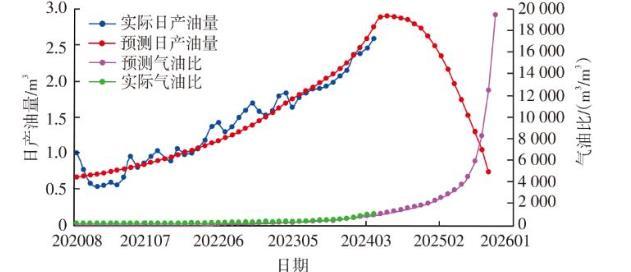 3)模型預測H3區(qū)生產(chǎn)井開發(fā)動態(tài)與實際生產(chǎn)動態(tài)相符,預計Y30-101井在2024年8月日產(chǎn)油量達到2.86 m3,氣油比達到907 m3/m3,隨后日產(chǎn)油量急劇降低,氣油比快速增加,開發(fā)人員可提前進行開發(fā)方案的制定與調(diào)整,防止氣油比快速升高。