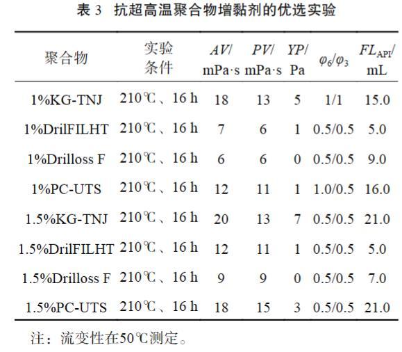 室內對4種高溫聚合物增黏劑材料進行了單劑抗溫性能對比評價。其中KG-TNJ為溫敏疏水締和聚合物提黏劑,DrilFILHT為納米片狀氧化鎂酚醛樹脂改性聚合物增黏降濾失劑材料,Drilloss F為納米微球聚合物復合增黏聚合物材料,PC-UTS為某國外代表性高溫聚合物材料。評價配方:基礎配方+2.5%KG-UTSTA+聚合物,實驗結果見表3。