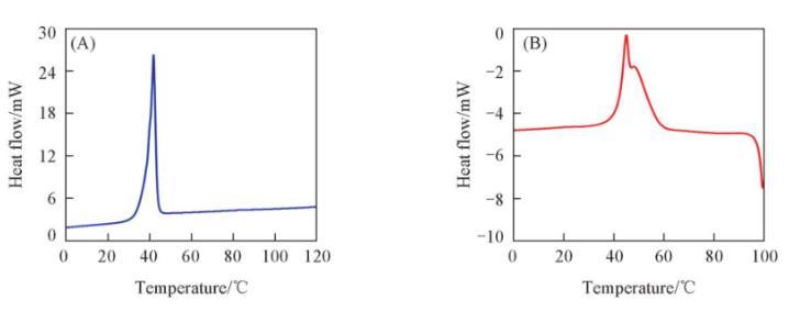 圖6(A)和(B)分別為空白樣品與負(fù)載型樣品的示差掃描量熱(DSC)曲線。從圖6(A)可以看出,L-薄荷醇樣品在大約42℃左右出現(xiàn)一個尖銳的吸熱峰,對應(yīng)于L-薄荷醇的熔點。而負(fù)載型樣品則出現(xiàn)了兩個吸熱峰[圖6(B)],其中第一個峰主要是由生長在DA-GQD外表面的薄荷醇小晶體融化引起的,而第二個峰主要是由DA-GQD包覆的薄荷醇小晶體融化引起的。這與劉紹華等的研究結(jié)果相類似。