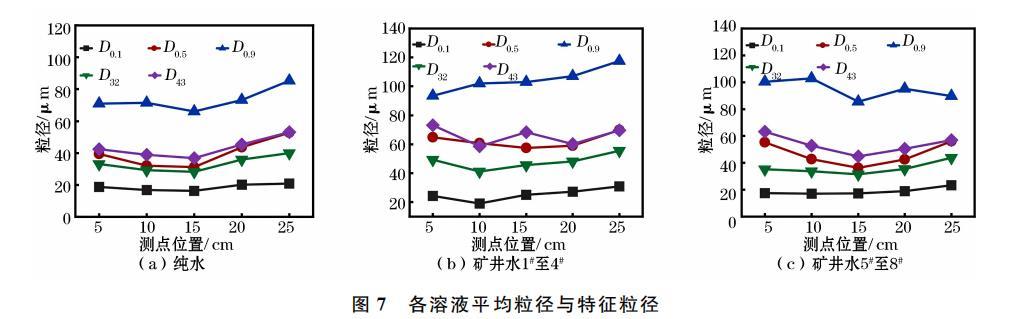 當進入惰性凝結區,噴霧壓力對霧滴的推動能力逐漸微弱,霧場中出現霧滴凝結沉降或細顆粒蒸發消失,粒徑開始增大。純水、礦井水1#至4#和礦井水5#至8#的霧化區粒徑臨界點分別為18cm、14.5cm、8.5cm,分布范圍差異明顯。這是由于Na+、K+離子濃度差異導致在噴霧過程中各組溶液所受表面張力不同,這表明霧化特性隨表面張力減小而明顯改善,在相同壓力下,較小的表面張力產生更快的噴射速度,迫使噴霧與空氣更充分相互作用并使霧化過程更完整。綜上所述,溶液表面張力決定噴霧形成過程中的破碎程度,從而影響霧化區范圍和噴霧霧化特性。