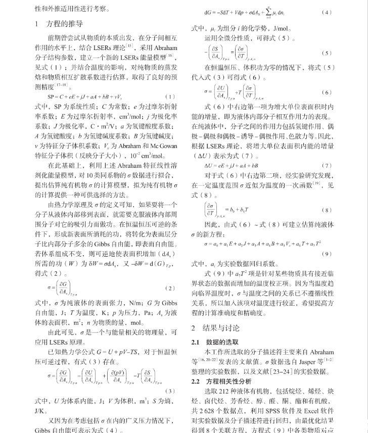 本工作提出一種將σ這一宏觀物性與微觀分子間作用力相關(guān)聯(lián)的一種新的計算方法。根據(jù)線性溶劑化能量關(guān)系(LSERs)理論和經(jīng)驗方程,提出了在不同溫度下估算純有機(jī)物σ的關(guān)聯(lián)式。利用所得關(guān)聯(lián)式對2 628個純組分體系中的10個同系物進(jìn)行了回歸,得到了σ的關(guān)聯(lián)方程,并對方程的相關(guān)性和外推適用性進(jìn)行考察。