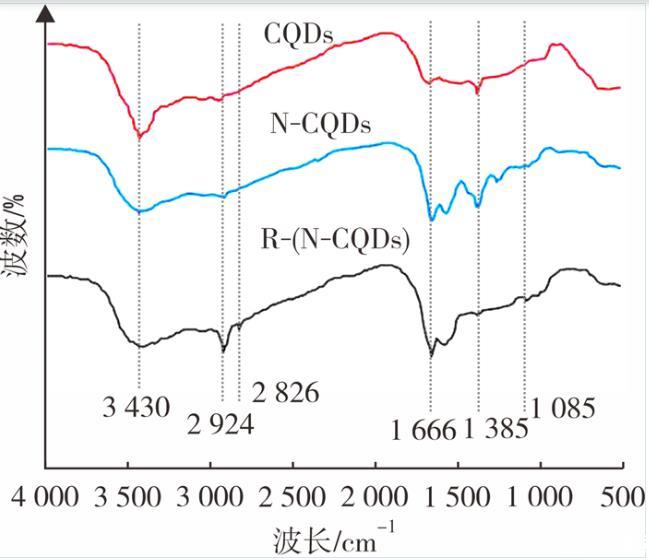 圖2是CQDs、N-CQDs與R-(N-CQDs)的紅外吸收光譜,在3 430 cm-1處的吸收峰是O-H和N-H伸縮振動(dòng),相比于N-CQDs,R-(N-CQDs)在此處的吸收峰較弱,說明在N-CQDs基礎(chǔ)上發(fā)生了一定程度的烷基化反應(yīng),而CQDs在此處的峰比N-CQDs與R-(N-CQDs)的峰要窄,因?yàn)镃QDs上只存在O-H的伸縮振動(dòng),在2 924 cm-1和2 824 cm-1處的吸收峰是C-H的伸縮振動(dòng),R-(N-CQDs)在此處的吸收峰比N-CQDs的要強(qiáng)。1 660 cm-1處的吸收峰對應(yīng)于酰胺基團(tuán)C=O鍵的拉伸振動(dòng),1 385 cm-1處的峰為C-O伸縮振動(dòng),1 085 cm-1處的峰為胺類烷基的C-N振動(dòng),R-(N-CQDs)在此處的峰較N-CQDs更為明顯,而CQDs在此處看不到任何吸收峰,進(jìn)一步說明在R-(N-CQDs)在N-CQDs的基礎(chǔ)上完成烷基化改性成功引入碳長鏈。圖2表明實(shí)現(xiàn)了將氮原子摻雜到碳量子點(diǎn)中的目標(biāo),并且在此基礎(chǔ)上引入了碳長鏈對其進(jìn)行表面修飾。